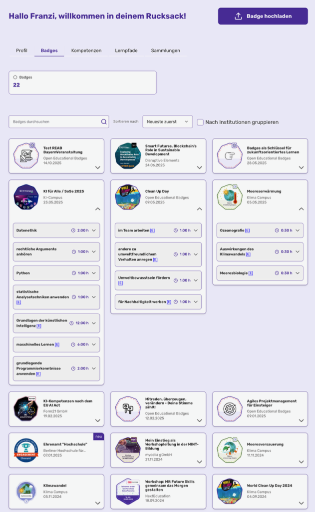 Darüber hinaus besteht die Möglichkeit, beim Service von OEB anzufragen, dass OEB über ein Plugin ins bestehende LMS integriert wird: In diesem Fall können deine Schüler:innen über ihren LMS-Zugang zu OEB gelangen und dort auf ihren individuellen digitalen „Rucksack“ zugreifen. Alle jemals erhaltenen Badges werden dort automatisch gesammelt (s. Screenshot 4). Auf dieser Basis entstehen unter dem Menüpunkt „Kompetenzen“ (s. oben in Screenshot 4) automatisch individuelle Kompetenzprofile (so wie oben in Screenshot 1).