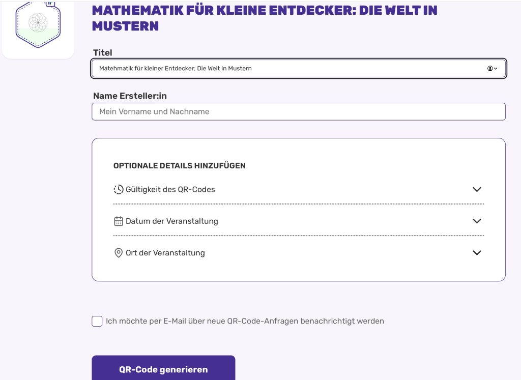 Die Vergabe der Badges erfolgt per E-Mail. Liegen die E-Mail-Adressen der Lernenden nicht vor, so wählst du bei der Badge-Vergabe die Option „QR-Code-Vergabe“ und gelangst dadurch zu einem Formular (s. Screenshot 3) mit dessen Hilfe sich ein QR-Code erstellen lässt. Auf diese Weise können deine Schüler:innen ihre E-Mail-Adressen unkompliziert selbst über den erstellten QR-Code eingeben, sodass du anschließend die Badge-Anfragen in OEB datensicher und mit nur einem Klick bestätigt kannst.