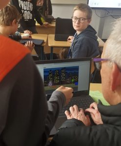 Am Ende der Woche wurden die Ergebnisse im Rahmen eines Gallery Walks in einem schulöffentlichen Rahmen präsentiert. Auch die Schulleitung (Herr Mérono, siehe Bild oben) testete die entstandenen Scratch-Spiele ausgiebig. Die besten Projekte wurden ausgezeichnet: